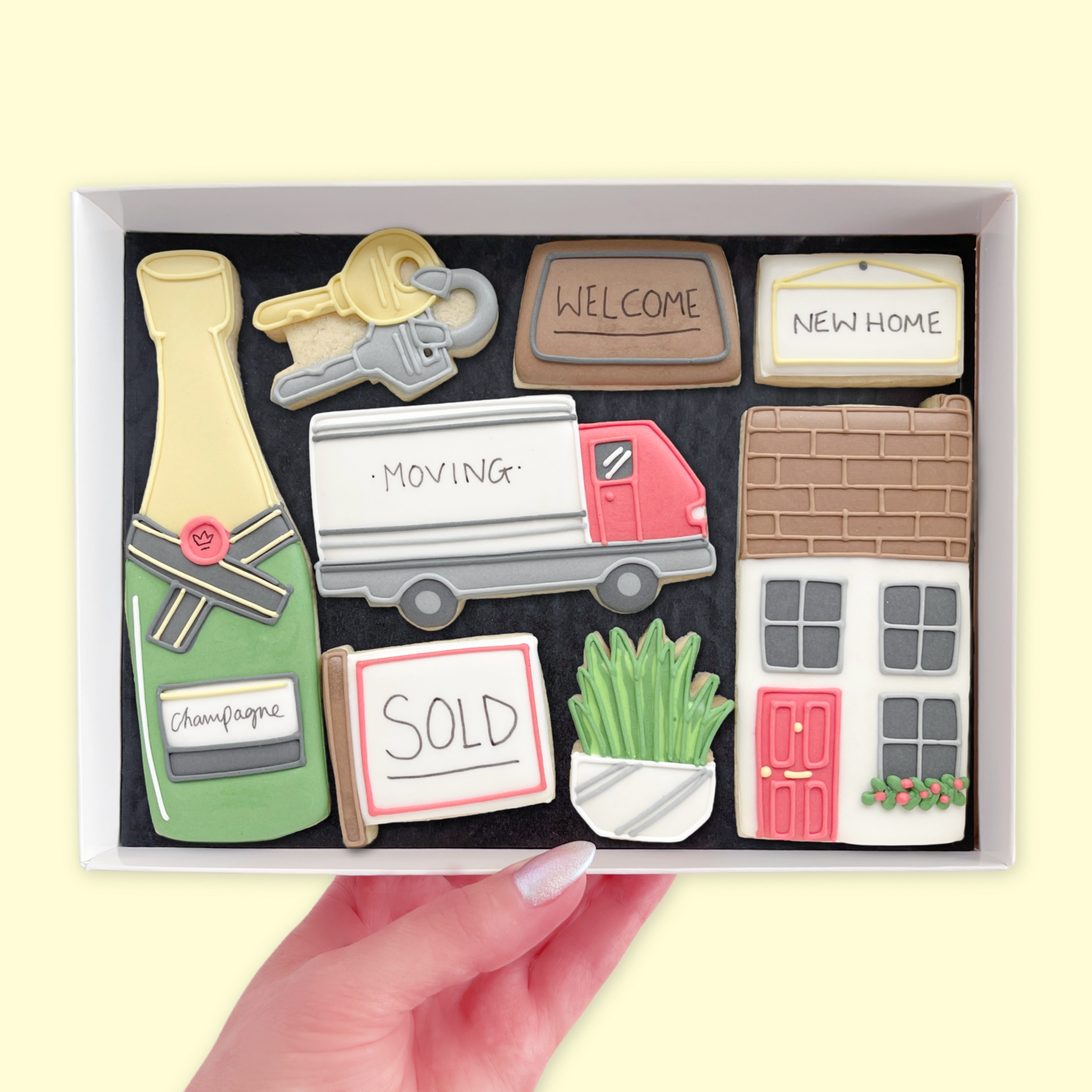 Celebrate a new home with our Hand-Iced Vanilla New Home Biscuits! Perfect for gifting to new homeowners or as a thoughtful gesture for housewarming parties, these handmade biscuits are beautifully decorated and presented in an elegant white gift box tied with a black ribbon. The perfect way to send your best wishes to those starting a new chapter in their lives.