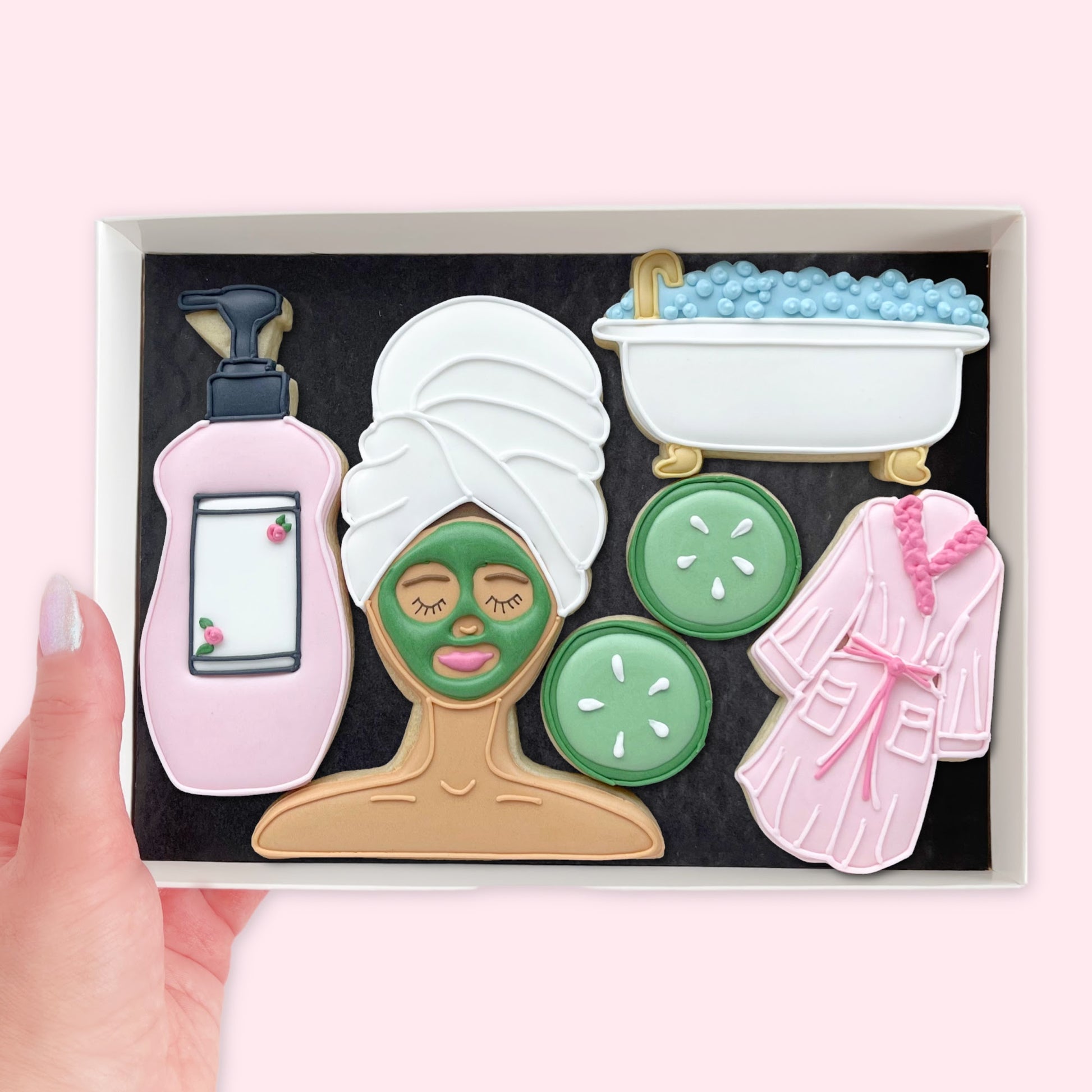Pamper yourself or someone special with these hand-iced vanilla biscuits, bring a little spa magic to your day. Each biscuit is carefully decorated by hand with charming spa-themed designs, perfect for enjoying with a cup of tea or gifting as a thoughtful treat. Presented in a white gift box and tied with a black ribbon, they’re a delightful way to add a touch of pampering to any day.